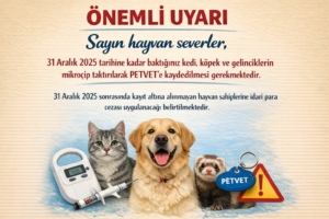 Dear animal lovers, cats, dogs, and ferrets under your care must be microchipped and registered in the PETVET system by 31 December 2025. It is stated that administrative fines will be imposed on owners of animals that are not registered after 31 December 2025. You may click the link to access the text published in the Official Gazette. https://www.resmigazete.gov.tr/eskiler/2025/03/20250305-14.htm